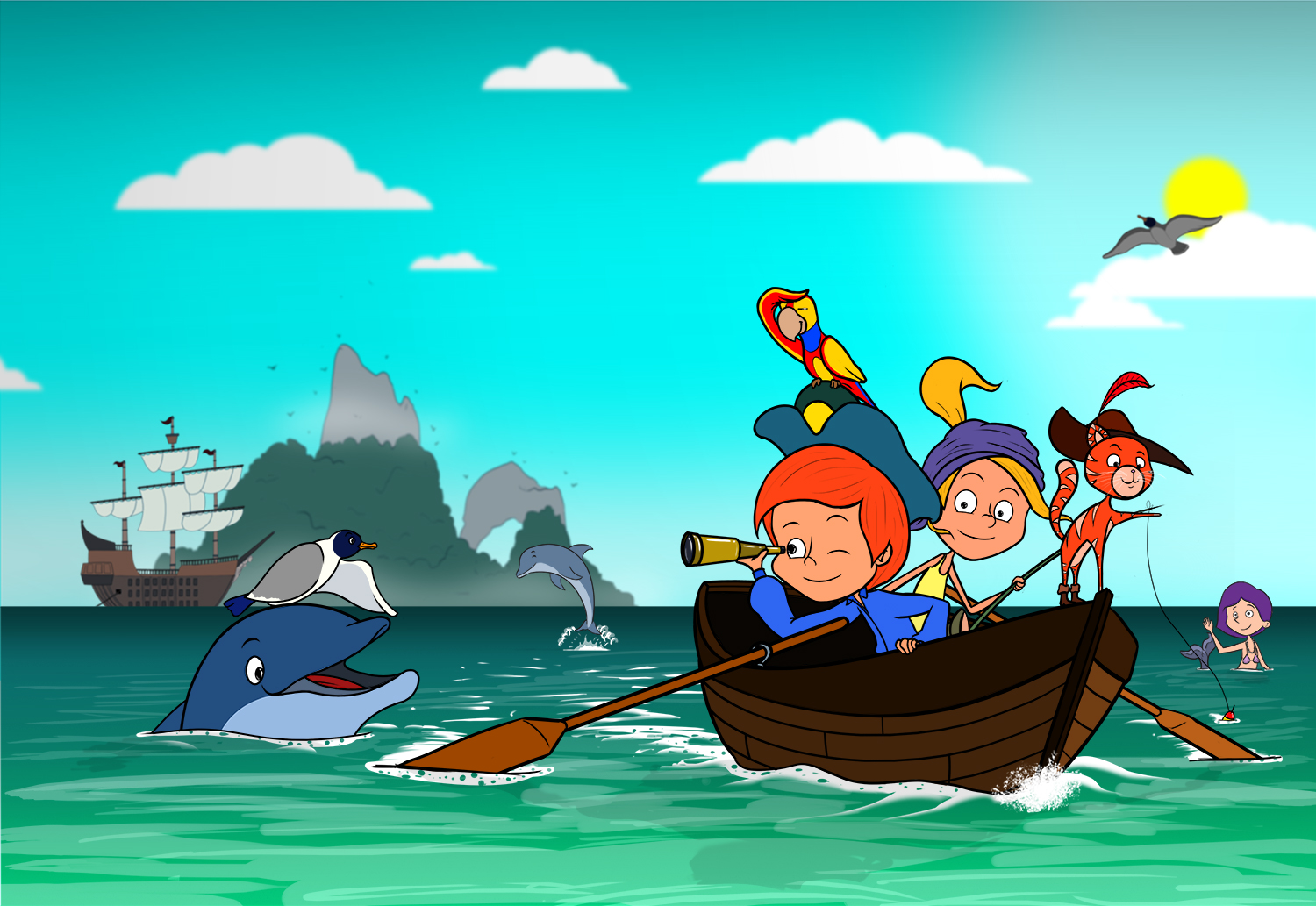 Illustration jeunesse de deux enfants piratess avec un chat dans une barque au milieu de l'océan.